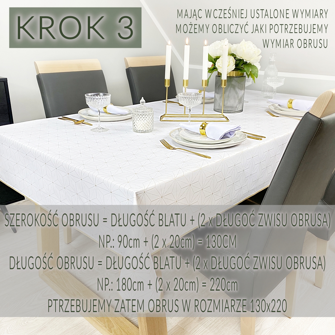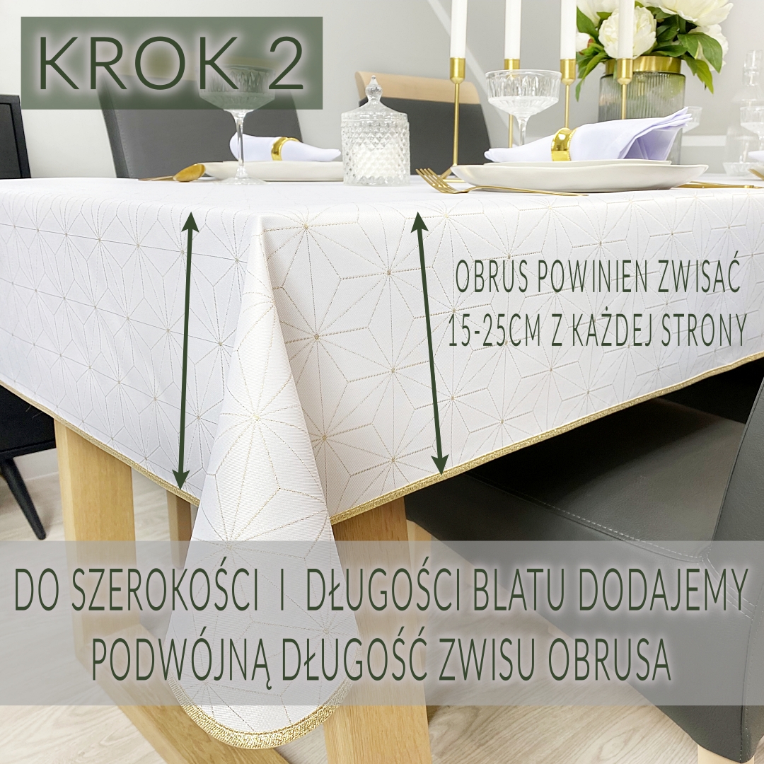 musimy zadbać o właściwą wielkość zwisu obrusa, która wynosi 20cm – jest to optymalna i najczęściej sprawdzająca się długość zwisu. Zatem do wymiarów blatu (długości i szerokości lub średnicy) należy dodać 40cm, wówczas z każdej strony stołu obrus będzie zwisał po 20cm. Jeżeli jednak chcesz, aby Twój obrus zwisał więcej należy dodać odpowiednio więcej centymetrów,